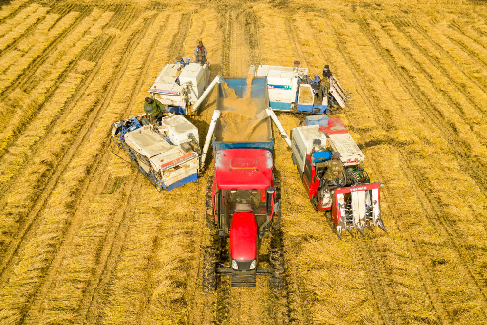 2024年10月13日,在黑龍江省綏化市北林區(qū)雙河鎮(zhèn),村民駕駛收割機(jī)進(jìn)行卸糧作業(yè)(無人機(jī)照片)。