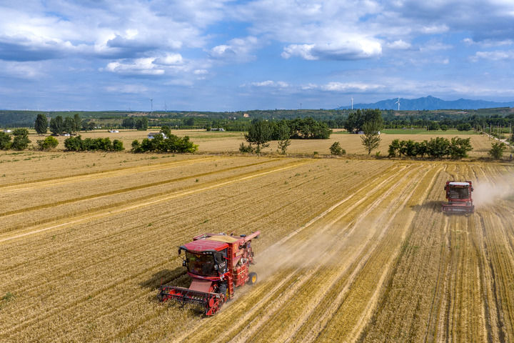 2024年6月5日,收割機(jī)在河南三門峽靈寶市的麥田里收獲小麥。新華社發(fā)(杜杰 攝)