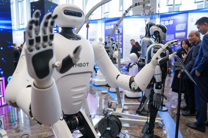 2025年2月14日在2025年蘇州市“人工智能+”創(chuàng)新發(fā)展推進(jìn)大會(huì)暨人工智能賦能新型工業(yè)化深度行(蘇州站)活動(dòng)現(xiàn)場拍攝的人形機(jī)器人。新華社記者 李博 攝
