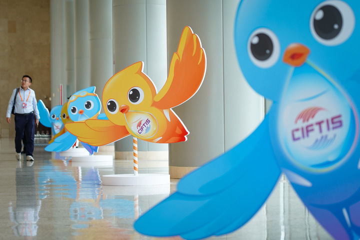 2024年9月11日在國家會(huì)議中心拍攝的服貿(mào)會(huì)吉祥物“福燕”形象。新華社記者 陳鐘昊 攝