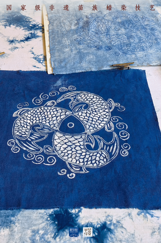 染色,就是將畫好圖案的土布,放入藍靛染缸中,反復(fù)浸泡多次,確保其上色。其間,作為防染劑的蠟自然龜裂,使布面呈現(xiàn)特殊的“冰紋”,具有獨特魅力。