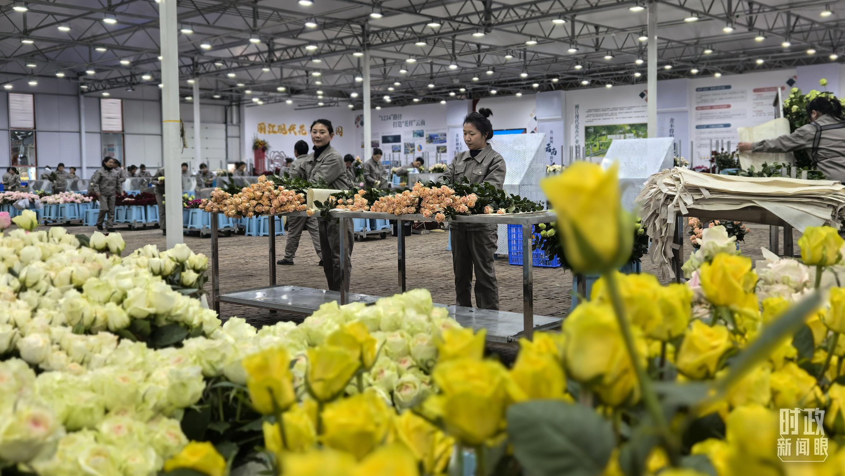 工人正在對采摘下來的鮮花進(jìn)行整理、分類。(總臺央視記者邢彬拍攝)