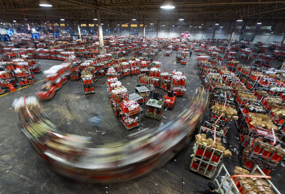 2022年11月11日,工作人員在昆明斗南花市給鮮花貼標(biāo)簽??爝f物流時(shí)效不斷優(yōu)化、冷鏈運(yùn)輸技術(shù)持續(xù)提升,也為中國(guó)鮮花加速“出海”保駕護(hù)航。