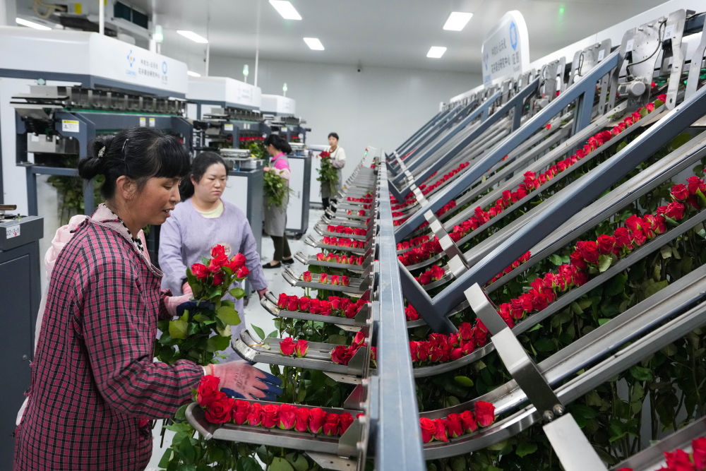 2024年8月23日,在云南晉寧花卉產(chǎn)業(yè)現(xiàn)代化示范園采后處理中心,花農(nóng)將鮮切花自動(dòng)分揀流水線上分揀好的鮮花取下,準(zhǔn)備放入包裝流水線。