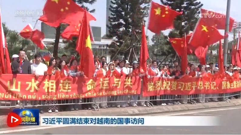 離開(kāi)河內(nèi)時(shí),越南總理范明政,越共中央政治局委員、中央書(shū)記處常務(wù)書(shū)記陳錦繡,越共中央書(shū)記處書(shū)記、中央辦公廳主任黎懷忠等越南黨政領(lǐng)導(dǎo)人和地方代表到機(jī)場(chǎng)送行。當(dāng)?shù)孛癖姾椭匈Y機(jī)構(gòu)、留學(xué)生代表高舉紅色橫幅,熱烈祝賀習(xí)近平訪問(wèn)越南取得圓滿成功。