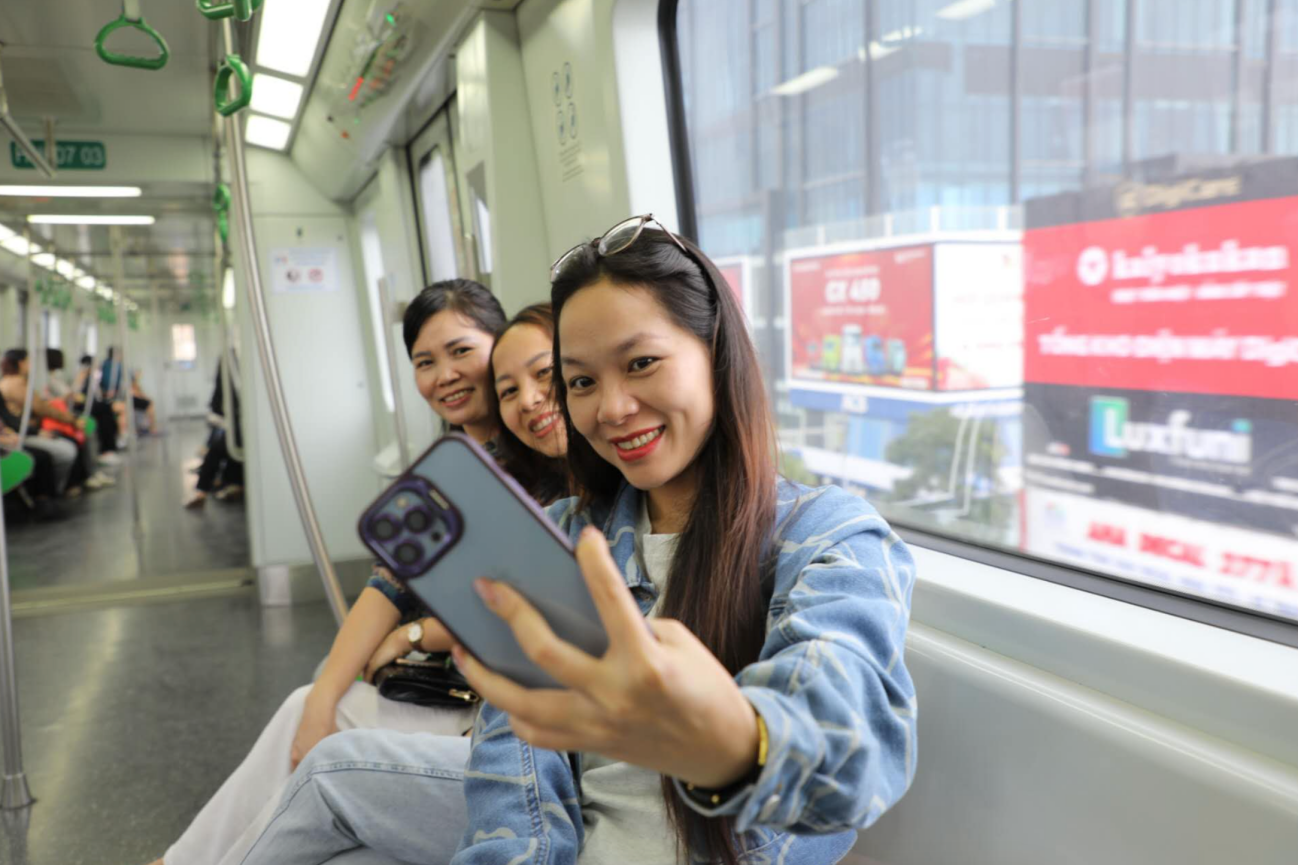 越南當?shù)孛癖娫诤觾?nèi)吉靈-河東線輕軌車廂里自拍。(人民日報記者 沈小曉 攝)