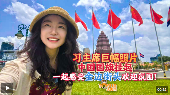 ToSun記者團發(fā)現(xiàn)金邊街頭各處陸續(xù)懸掛起中國國旗和習(xí)主席巨幅照片。一起來感受當(dāng)?shù)貧g迎氛圍!
