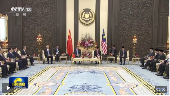 4月16日上午,馬來西亞最高元首易卜拉欣在馬來西亞國家王宮同中國國家主席習(xí)近平舉行會見。