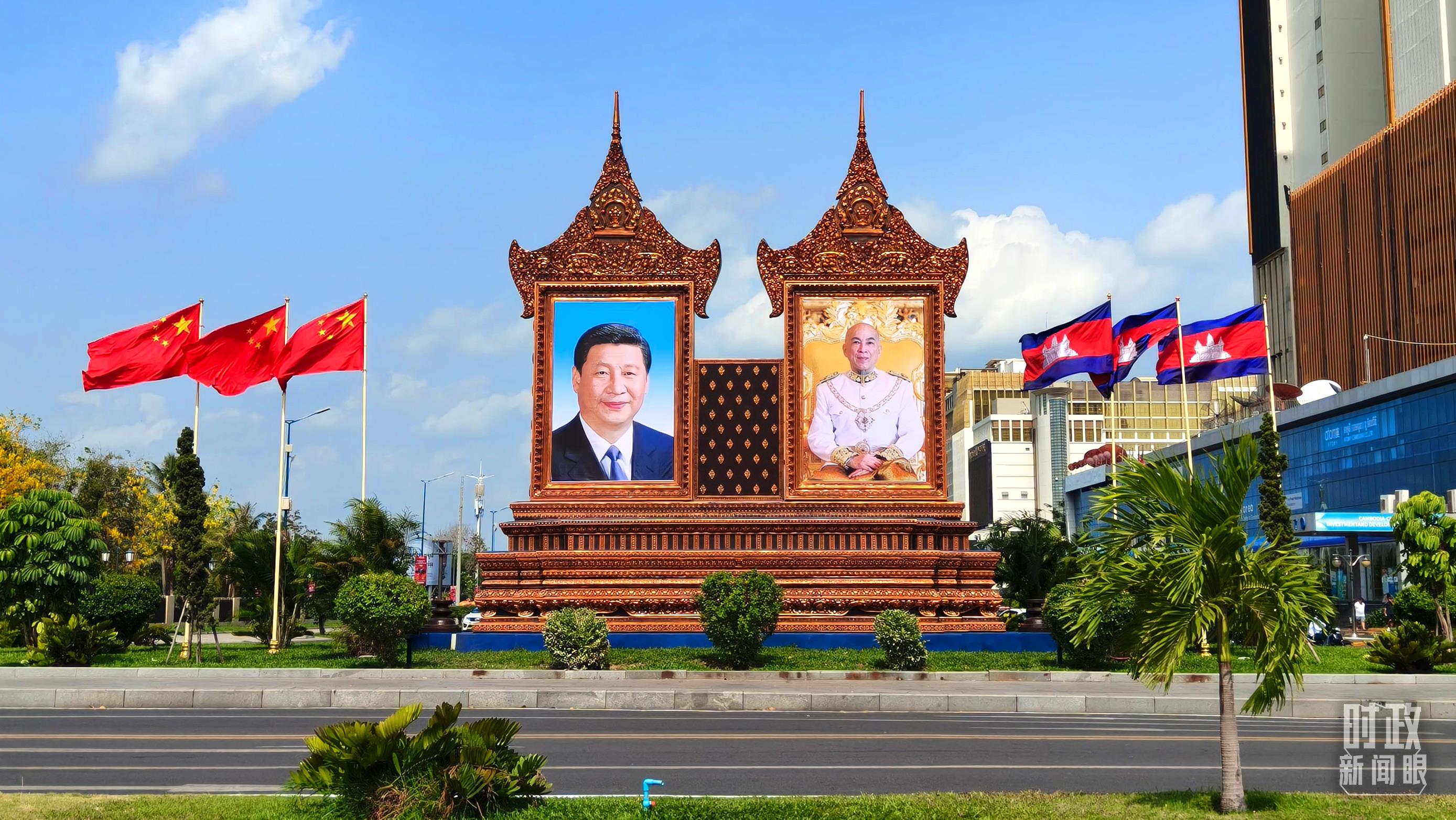 金邊街頭的巨幅兩國(guó)領(lǐng)導(dǎo)人照片和兩國(guó)國(guó)旗。(總臺(tái)央視記者陸泓宇拍攝)