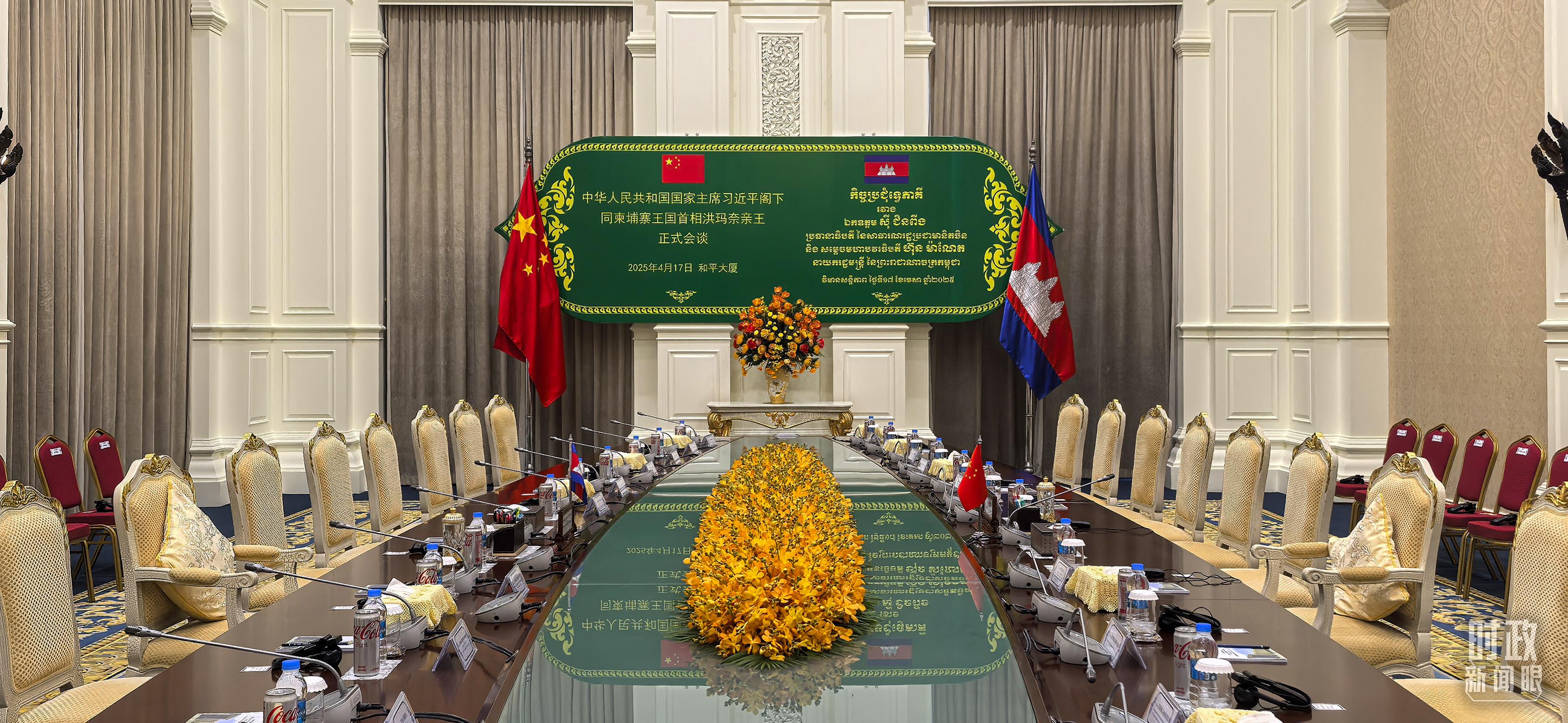 金邊和平大廈,習(xí)主席同洪森、洪瑪奈的會(huì)見(jiàn)會(huì)談在這里舉行。(總臺(tái)央視記者范一鳴拍攝)