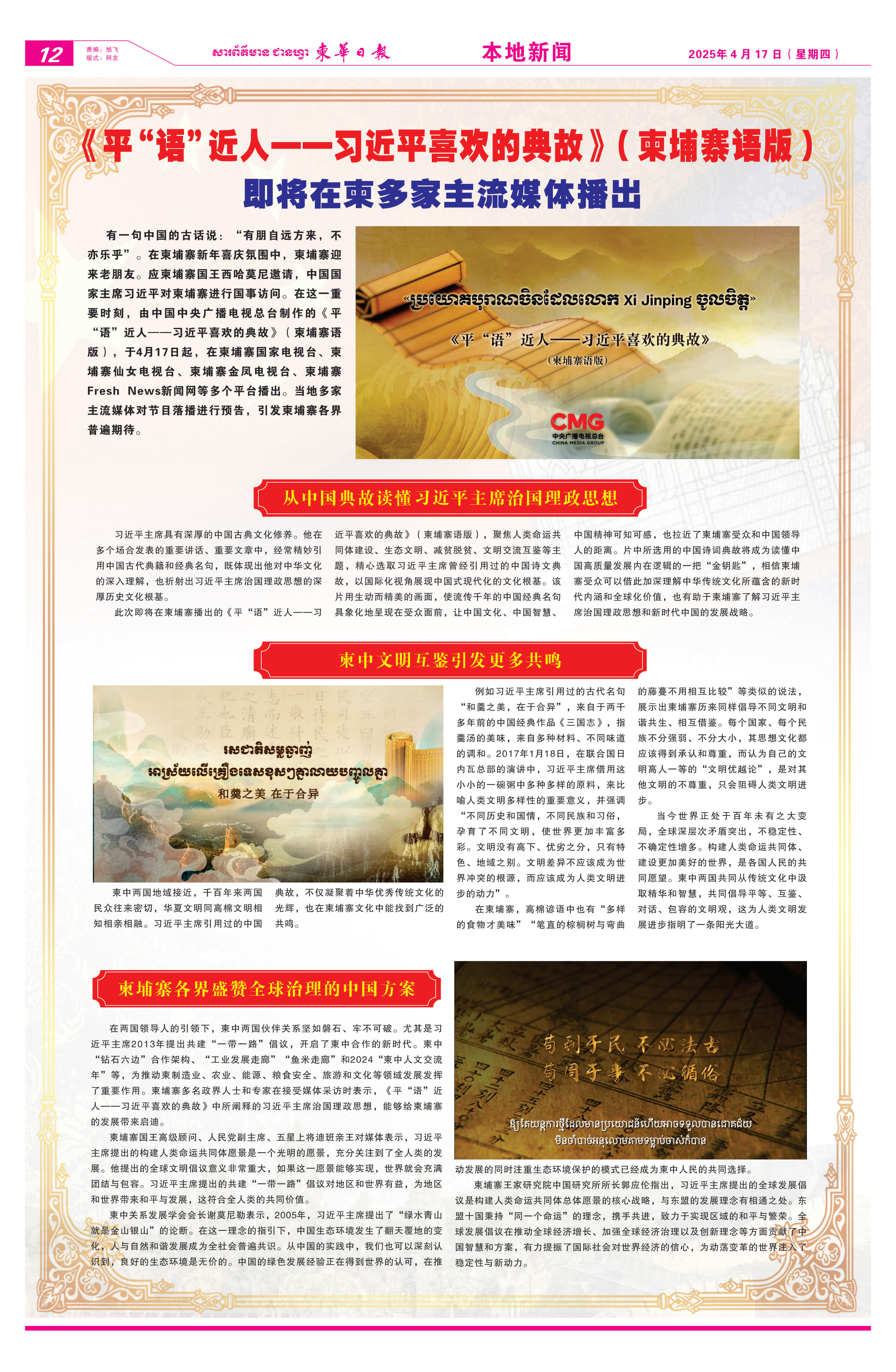 4月12日至17日,《柬華日報(bào)》《大都市報(bào)》等當(dāng)?shù)貓?bào)紙刊發(fā)節(jié)目播出預(yù)告消息。文章指出,《平“語”近人——習(xí)近平喜歡的典故》(柬埔寨語版)是一把讀懂中國高質(zhì)量發(fā)展內(nèi)在邏輯的“金鑰匙”,相信柬埔寨受眾可以通過這些中國古籍和經(jīng)典名句加深理解中華優(yōu)秀傳統(tǒng)文化所蘊(yùn)含的新時(shí)代內(nèi)涵和全球化價(jià)值,了解習(xí)近平主席治國理政思想和新時(shí)代中國的發(fā)展戰(zhàn)略。
