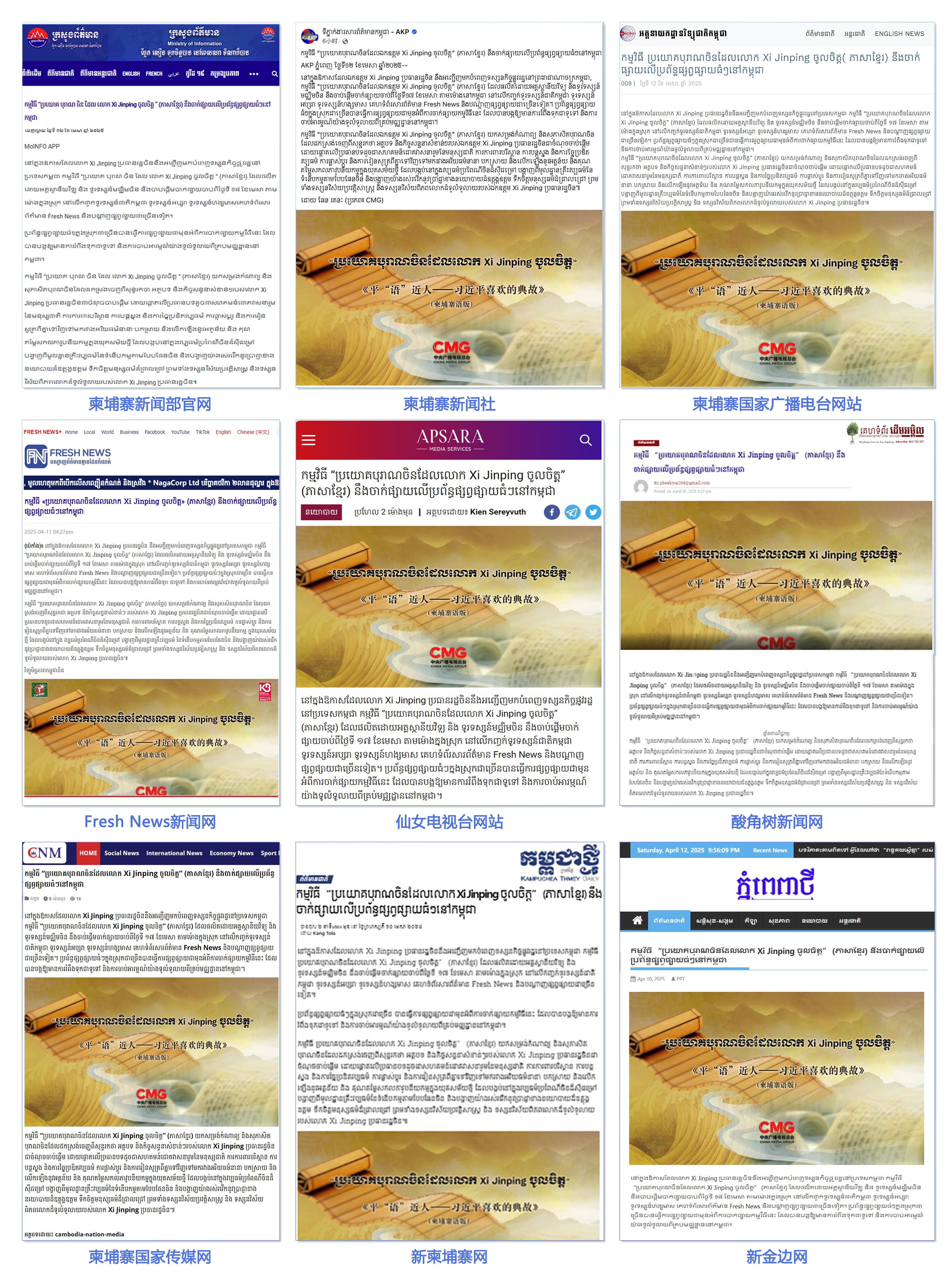 柬埔寨新聞部官網(wǎng)、柬埔寨新聞社、柬埔寨國家廣播電臺(tái)網(wǎng)站、Fresh News新聞網(wǎng)、仙女電視臺(tái)網(wǎng)站、柬中記協(xié)網(wǎng)站、酸角樹新聞網(wǎng)、柬埔寨國家傳媒網(wǎng)、新柬埔寨網(wǎng)、新金邊網(wǎng)、《金邊日報(bào)》網(wǎng)等柬主流媒體發(fā)布相關(guān)報(bào)道。