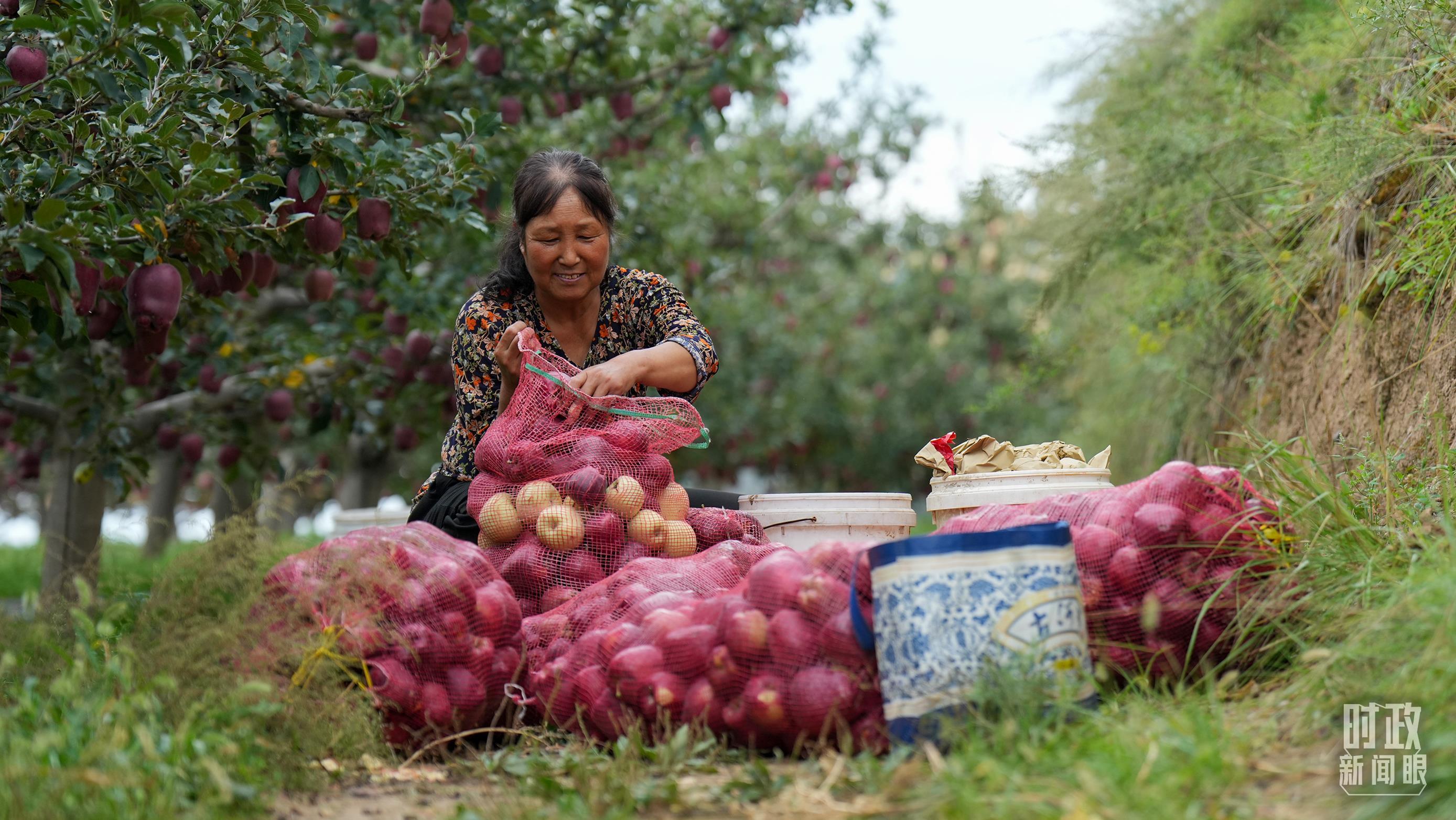 △甘肅天水市南山花牛蘋果基地帶動當?shù)卮迕駥崿F(xiàn)增收。(總臺記者李晉拍攝)