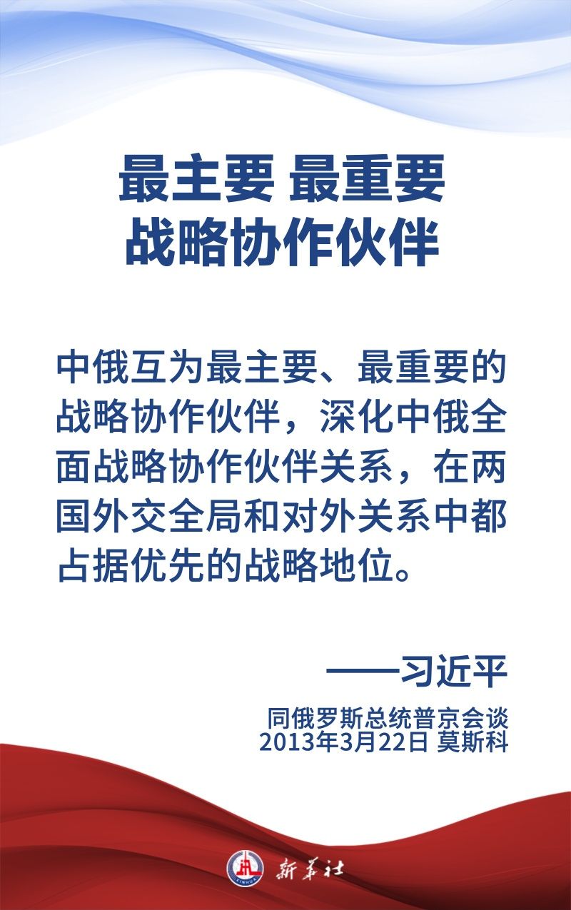 中俄關(guān)系歷經(jīng)風雨,歷久彌堅,樹立了大國、鄰國永久睦鄰友好、全面戰(zhàn)略協(xié)作、互利合作共贏的典范。習近平主席和普京總統(tǒng)保持密切交往,為新時代中俄關(guān)系作出頂層設(shè)計,提供戰(zhàn)略引領(lǐng)。在國事訪問等重要場合,習近平主席這樣論述中俄關(guān)系——