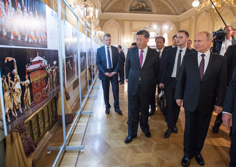 2019年6月5日,國家主席習(xí)近平和俄羅斯總統(tǒng)普京在莫斯科大劇院共同出席中俄建交70周年紀(jì)念活動(dòng)。這是兩國元首共同參觀中俄建交70周年圖片展。