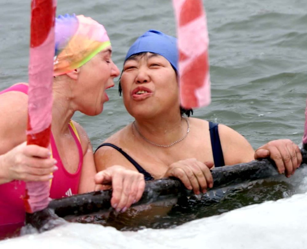 2002年1月15日,多次來華參加冬泳賽事的俄羅斯選手柳德米拉(左),在第二屆哈爾濱國際冬泳邀請(qǐng)賽上親吻老朋友、好姐妹——中國女隊(duì)員楊翠芬。