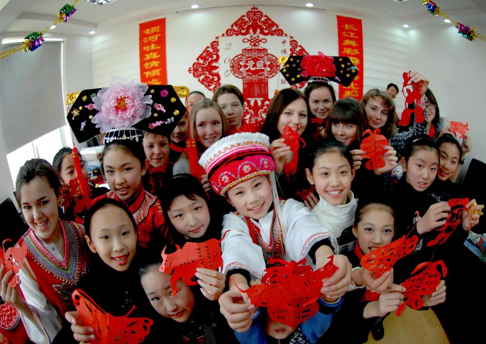 2008年12月30日,中俄學(xué)生在沈陽“莫斯科學(xué)生體驗(yàn)中國冬令營”活動(dòng)上展示自己的剪紙作品。