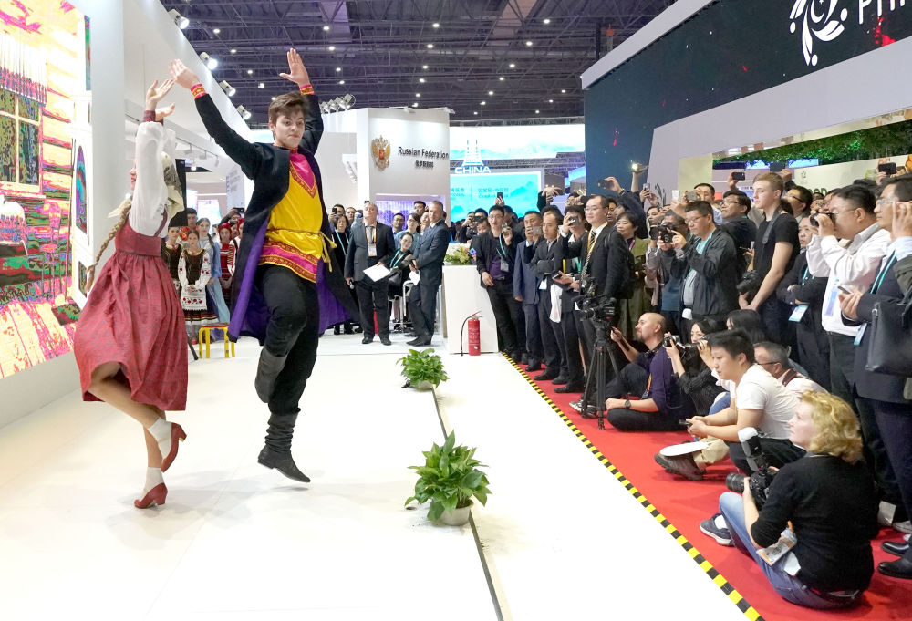 2018年11月6日,俄羅斯演員在上海舉行的首屆中國國際進(jìn)口博覽會(huì)俄羅斯展區(qū)表演舞蹈。