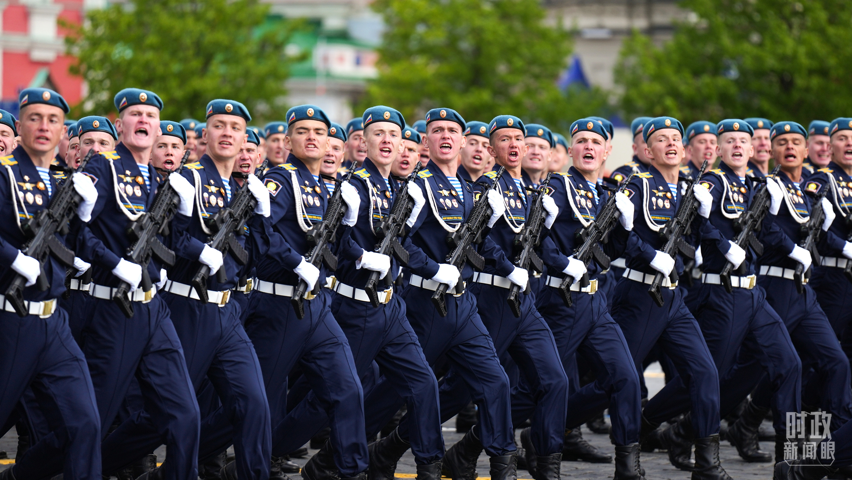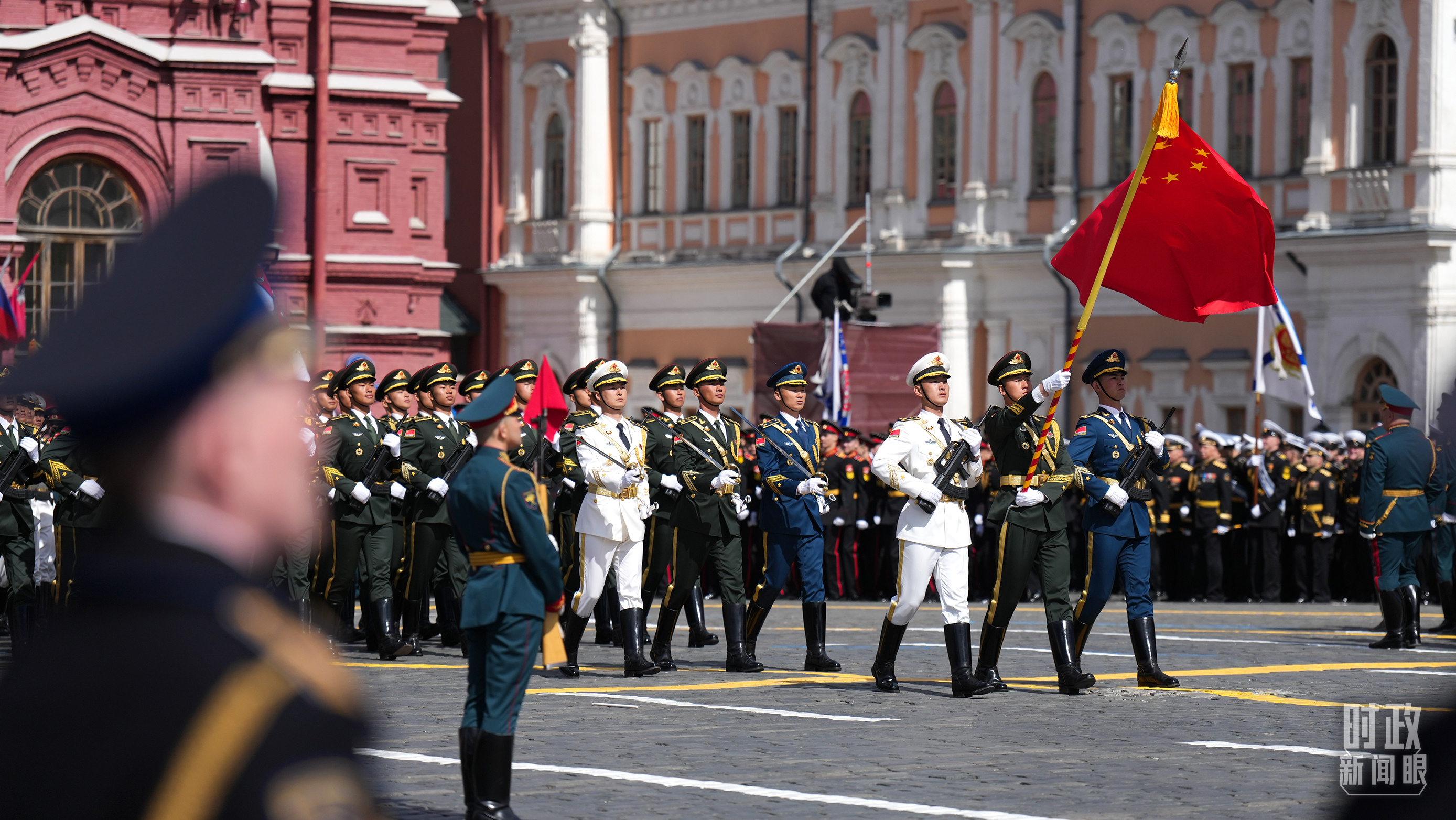 中國人民解放軍三軍儀仗隊(duì)方隊(duì)軍容嚴(yán)整、士氣高昂,邁著堅(jiān)定有力的步伐走過紅場。(總臺記者李晉拍攝)
