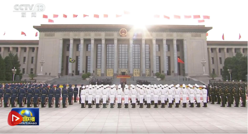 盧拉抵達(dá)時(shí),禮兵列隊(duì)致敬。習(xí)近平同盧拉登上檢閱臺(tái),軍樂(lè)團(tuán)奏中巴兩國(guó)國(guó)歌,天安門(mén)廣場(chǎng)鳴放禮炮21響。盧拉在習(xí)近平陪同下檢閱中國(guó)人民解放軍儀仗隊(duì),并觀看分列式。