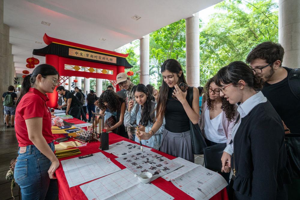 2025年4月,在巴西里約熱內(nèi)盧天主教大學(xué)舉辦的“國際中文日”慶?;顒由?,學(xué)生們體驗中文書法。