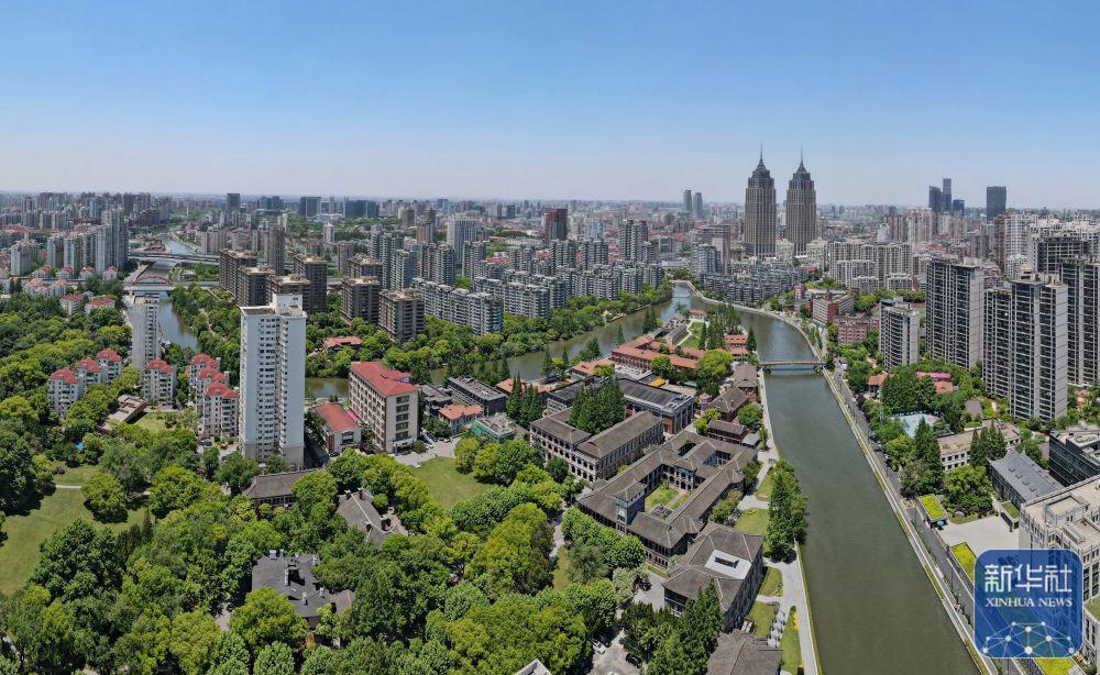 蘇州河華東政法大學(xué)段的歷史建筑群(無(wú)人機(jī)照片,2023年3月3日攝)。