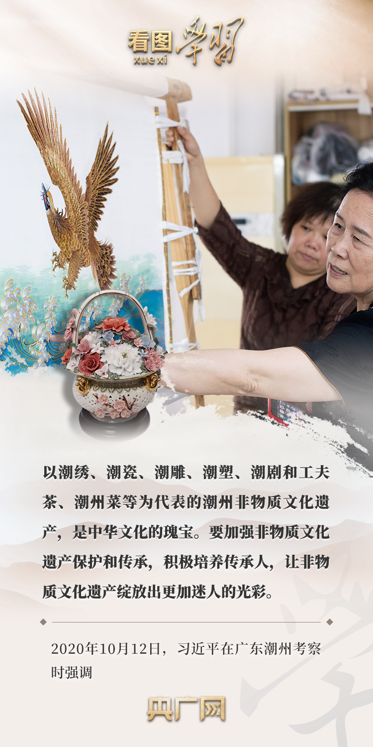 從古典民族史詩《格薩(斯)爾》到潮繡、潮瓷、潮劇和工夫茶,再到漢中藤編、常德絲弦……在各地考察調(diào)研時,習近平總書記曾多次就文化傳承發(fā)展、非物質(zhì)文化遺產(chǎn)保護作出重要指示,強調(diào)要“讓非物質(zhì)文化遺產(chǎn)綻放出更加迷人的光彩”。