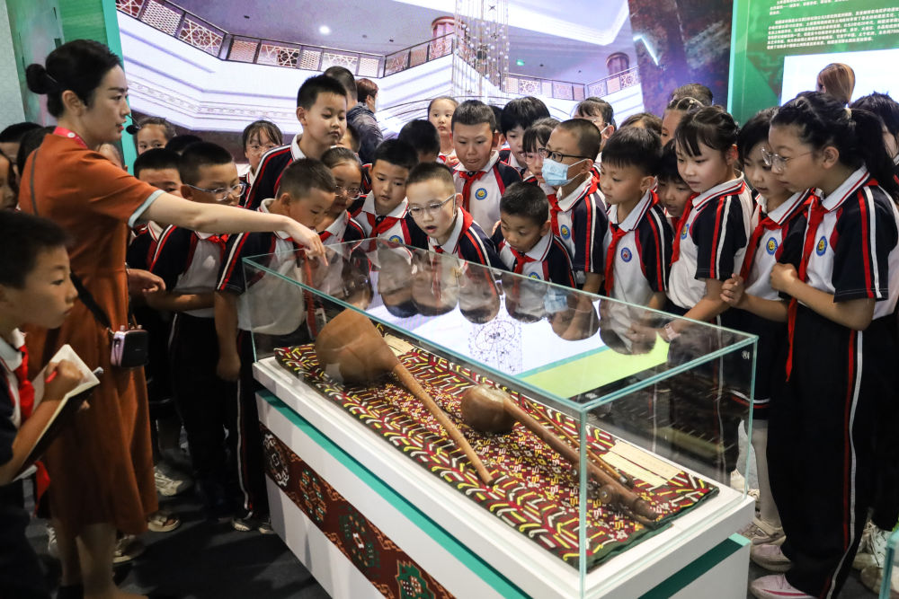 2023年9月7日,在甘肅敦煌舉行的第六屆絲綢之路(敦煌)國(guó)際文化博覽會(huì)上,學(xué)生們參觀土庫(kù)曼斯坦專題展。