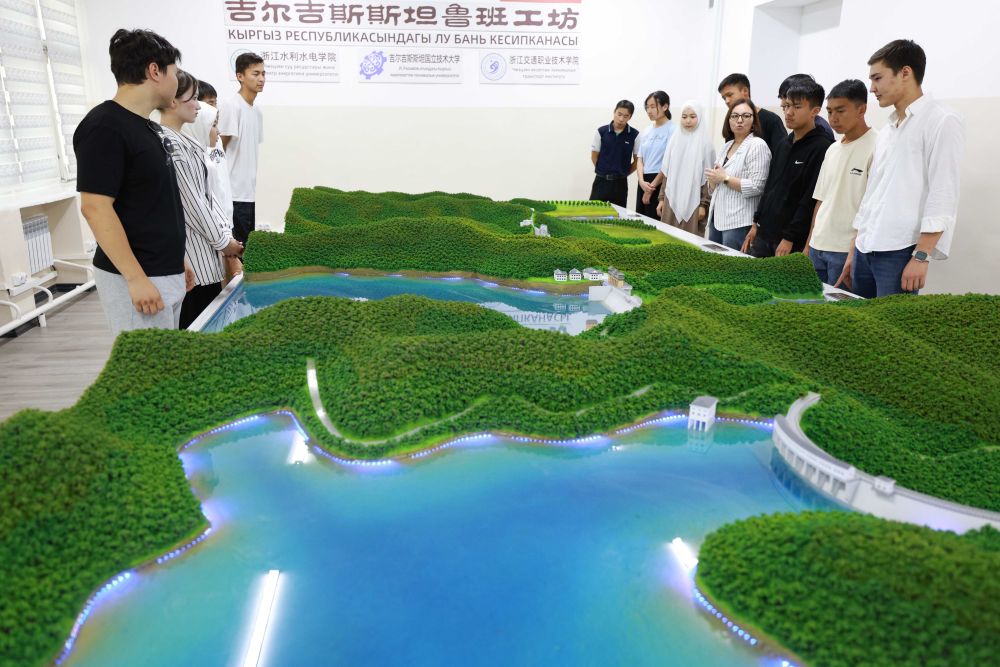 2025年6月4日,學(xué)生在吉爾吉斯斯坦首都比什凱克的魯班工坊水利樞紐工程模擬演示實(shí)驗(yàn)室學(xué)習(xí)水電站知識(shí)。這家魯班工坊由浙江水利水電學(xué)院與吉爾吉斯斯坦國(guó)立技術(shù)大學(xué)等聯(lián)合建設(shè),投入運(yùn)行半年多來,已有4000多名學(xué)生在這里接受技術(shù)培訓(xùn)。