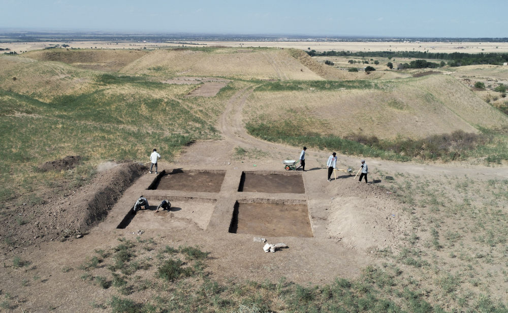 2023年8月9日,考古人員在中哈聯(lián)合考古項(xiàng)目拉哈特遺址探方上工作(無人機(jī)照片)。從2017年開始,陜西省考古研究院與哈薩克斯坦伊塞克國(guó)家歷史文化博物館組成聯(lián)合考古隊(duì),對(duì)拉哈特遺址及附近相關(guān)遺址開展考古調(diào)查與發(fā)掘工作。