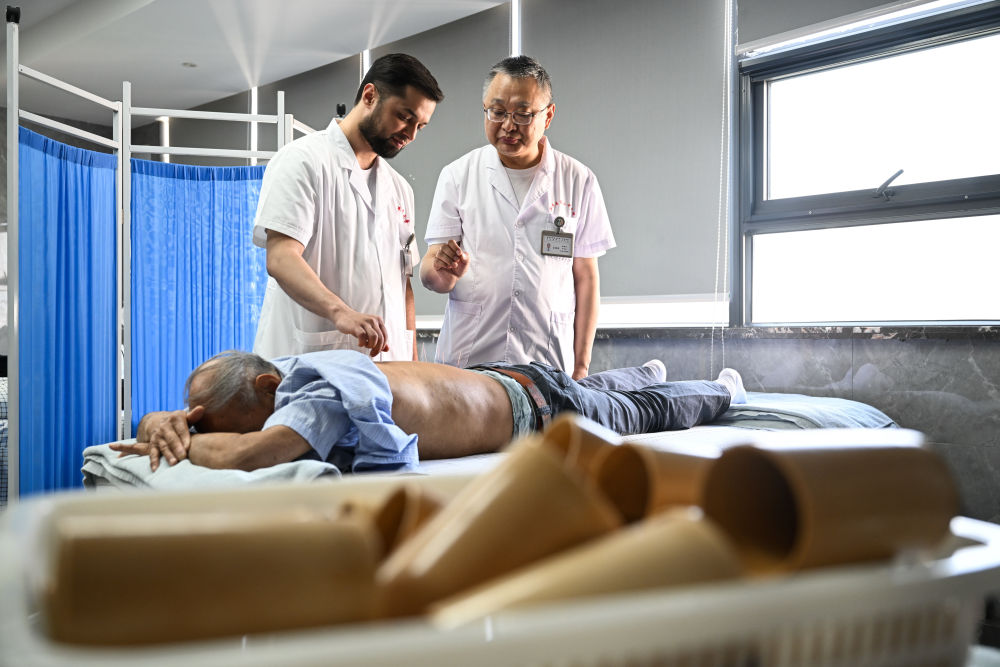 2025年4月18日,在南京中醫(yī)藥大學(xué)第二附屬醫(yī)院針灸康復(fù)科,李小龍(后左)在導(dǎo)師張建斌指導(dǎo)下給患者行針。南京中醫(yī)藥大學(xué)2023級(jí)針灸推拿專業(yè)的碩士研究生阿米爾中來自塔吉克斯坦首都杜尚別。中學(xué)時(shí),他愛上了中國(guó)文化,給自己取了個(gè)中文名字“李小龍”。他刻苦學(xué)習(xí)中文,參加漢語(yǔ)橋中學(xué)生中文比賽,后來多次來到中國(guó),與中醫(yī)結(jié)緣。2015年,李小龍到北京中醫(yī)藥大學(xué)學(xué)習(xí)針灸推拿,畢業(yè)后回到杜尚別開了自己的中醫(yī)診所。2023年,為了進(jìn)一步提升自己,李小龍來到南京中醫(yī)藥大學(xué)攻讀碩士研究生?!敖窈?,我希望把中醫(yī)帶到更多的國(guó)家,讓更多人感受中醫(yī)的妙處。”