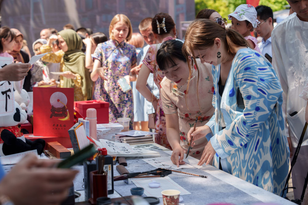 2025年4月19日,在哈薩克斯坦阿拉木圖,一名中國(guó)文化愛好者在“國(guó)際中文日”慶?;顒?dòng)上體驗(yàn)書法。