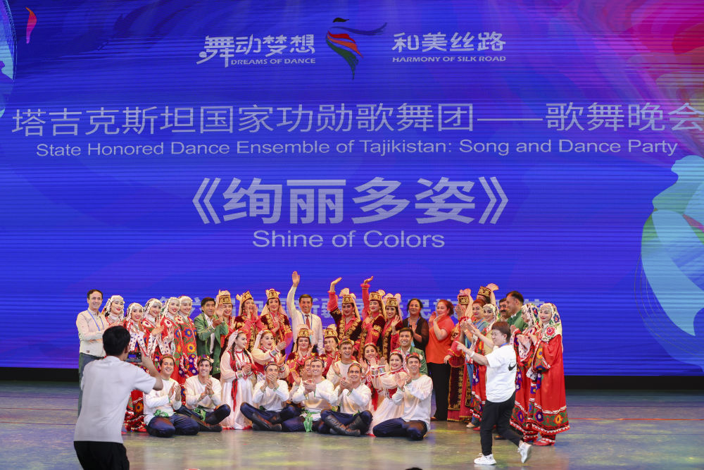 2023年7月27日,由塔吉克斯坦羅拉國(guó)家功勛歌舞團(tuán)帶來的歌舞晚會(huì)《絢麗多姿》在新疆烏魯木齊晚報(bào)劇院上演。這是演員在演出結(jié)束后合影留念。