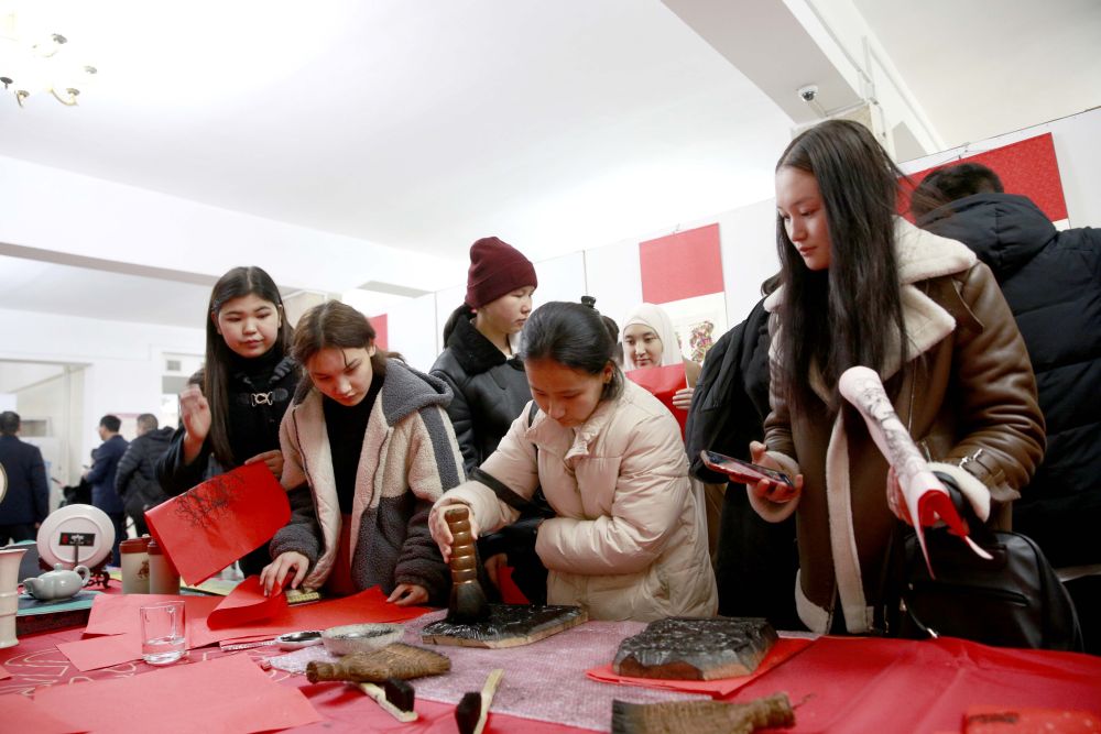 2023年12月26日,人們?cè)诩獱柤顾固贡仁矂P克舉行的“一帶一路”暨中原文化交流展上體驗(yàn)中國(guó)文化。本次展覽主要展出了以“拓傳春秋”為主題的石刻藝術(shù)及以“年畫”為主題的木刻和剪紙藝術(shù)作品。