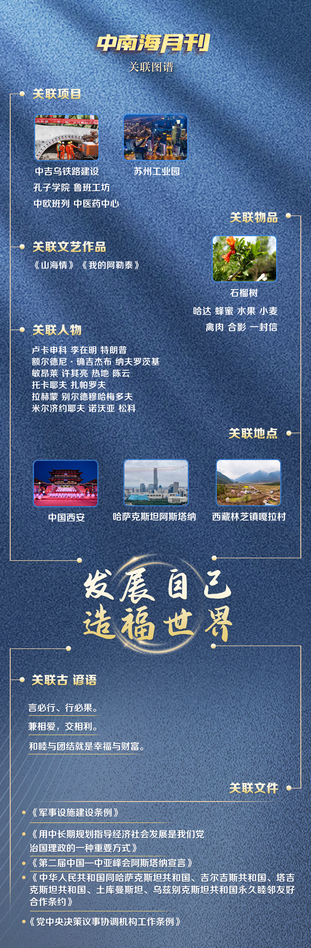 關聯(lián)圖譜中西安、阿斯塔納兩個地點,因中國與中亞五國的特殊情誼,有了別樣意義——兩年前,首屆中國—中亞峰會在古絲綢之路起點西安舉行。兩年后,第二屆中國—中亞峰會來到哈薩克斯坦首都阿斯塔納,這里正是共建“一帶一路”的首倡之地。