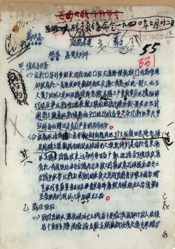 為粉碎侵華日軍的“囚籠政策”、遏制國民黨頑固派的妥協(xié)投降逆流,1940年8月至翌年1月,中國共產(chǎn)黨領(lǐng)導(dǎo)的八路軍在華北發(fā)動了百團(tuán)大戰(zhàn)。百團(tuán)大戰(zhàn)第一階段以破襲正太鐵路為重點,這是1940年7月22日簽發(fā)的破襲正太路戰(zhàn)役預(yù)備命令(中央檔案館提供)。