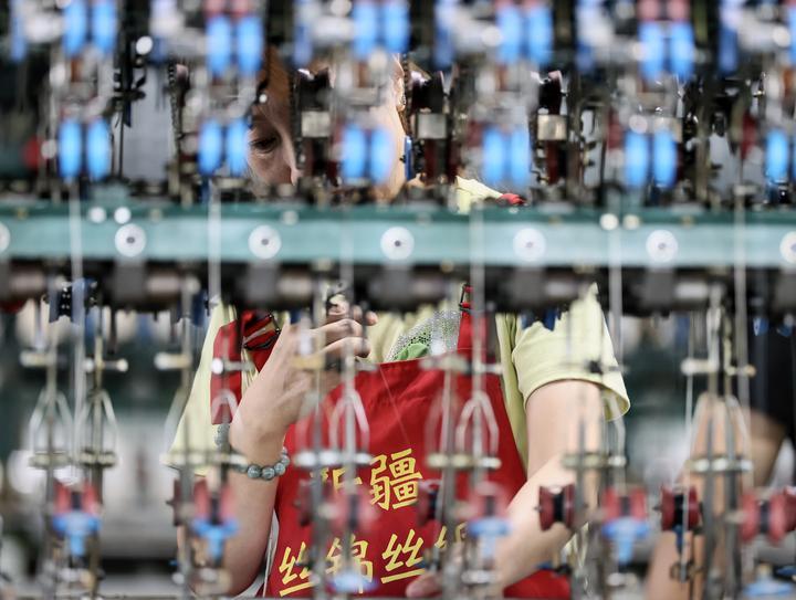 2025年7月29日,工人在新疆絲錦絲綢紡織有限公司生產車間內的自動繅絲機上作業(yè)。近年來,新疆塔城地區(qū)烏蘇市引進桑蠶繭絲綢智能化全產業(yè)鏈項目,鼓勵農民種桑養(yǎng)蠶,拓寬興邊富民新“絲”路。