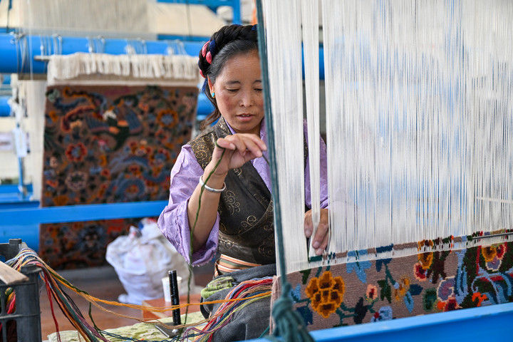 2025年7月18日,江孜藏毯文化發(fā)展有限責任公司的員工在生產車間內編織藏毯。西藏日喀則市江孜縣是著名的藏毯(藏族稱為“卡墊”)之鄉(xiāng),織毯歷史悠久。藏族卡墊織造技藝于2006年被列入國家級非物質文化遺產代表性項目名錄。近年來,江孜藏毯在守護傳統(tǒng)技藝的同時積極創(chuàng)新,通過建立合作社、開辦技能培訓班等方式擴大靈活就業(yè)規(guī)模,讓更多人在家門口織藏毯增收。