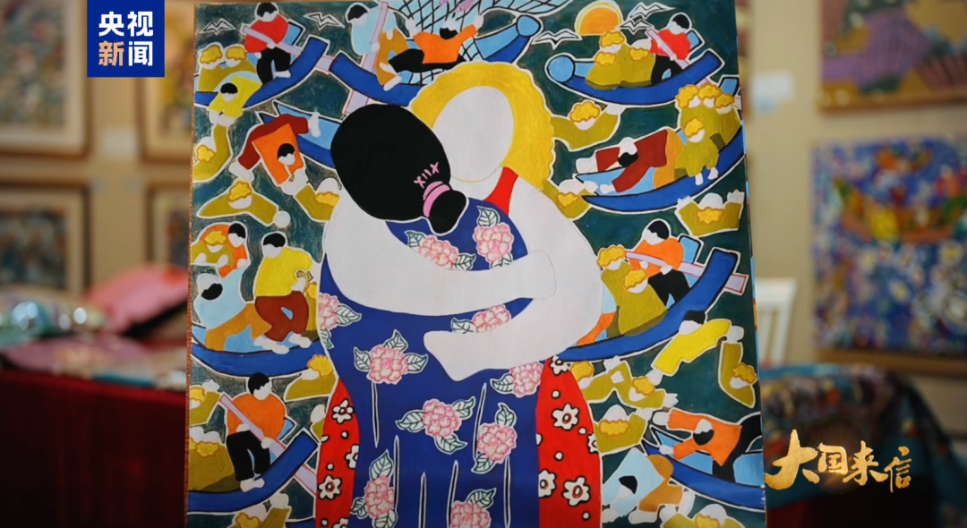 吳小飛也回贈了一件禮物。由于她是一名漁民畫創(chuàng)作者,于是就把一幅名為《擁抱》的作品創(chuàng)作出來送給了對方。在她看來,這不但是她們兩個人的擁抱,也是國和國的擁抱。