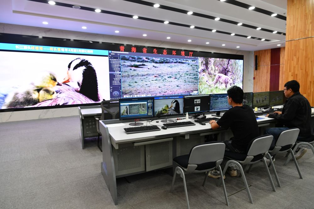 8月8日,青海省生態(tài)環(huán)境廳信息中心工作人員正在分析野生動(dòng)物監(jiān)測(cè)畫面。(劉紅 攝)