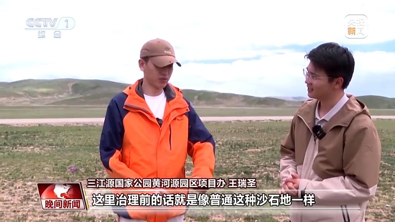 三江源國家公園黃河源園區(qū)項目干事 王瑞圣:這里治理前就像普通沙石地一樣,治理完的成效就是這樣子的,我們的草籽就在當時切割的凹槽里面生長,這些草籽好多根部已經(jīng)進行分裂了,所以會顯得非常茂密。