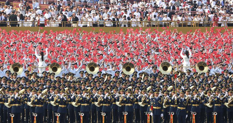 紀(jì)念大會開始前,天安門廣場上,千人聯(lián)合軍樂團演奏四首歌曲,合唱團唱響《松花江上》《在太行山上》《保衛(wèi)黃河》《沒有共產(chǎn)黨就沒有新中國》。