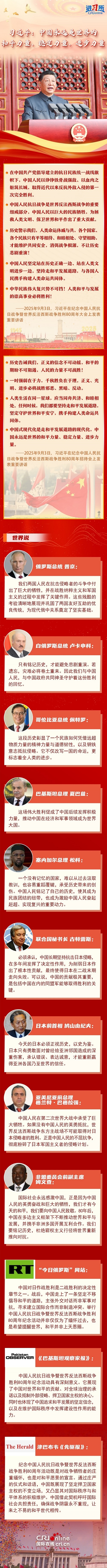 “中國永遠(yuǎn)是世界的和平力量、穩(wěn)定力量、進(jìn)步力量?!睆膭?chuàng)建聯(lián)合國到提出和平共處五項(xiàng)原則,再到推動(dòng)構(gòu)建人類命運(yùn)共同體,中國始終面向光明,做世界和平與安全的堅(jiān)定維護(hù)者。國際社會高度評價(jià)中國為世界反法西斯戰(zhàn)爭勝利作出的巨大貢獻(xiàn),認(rèn)為抗戰(zhàn)不僅改寫中國的命運(yùn),更標(biāo)志著全人類的進(jìn)步;戰(zhàn)后的中國走上了一條堅(jiān)定不移倡導(dǎo)和平發(fā)展的道路,并以此次紀(jì)念活動(dòng)為契機(jī),呼吁國際社會共擔(dān)責(zé)任,確保戰(zhàn)爭陰霾永不重現(xiàn),讓來之不易的和平世代相傳。