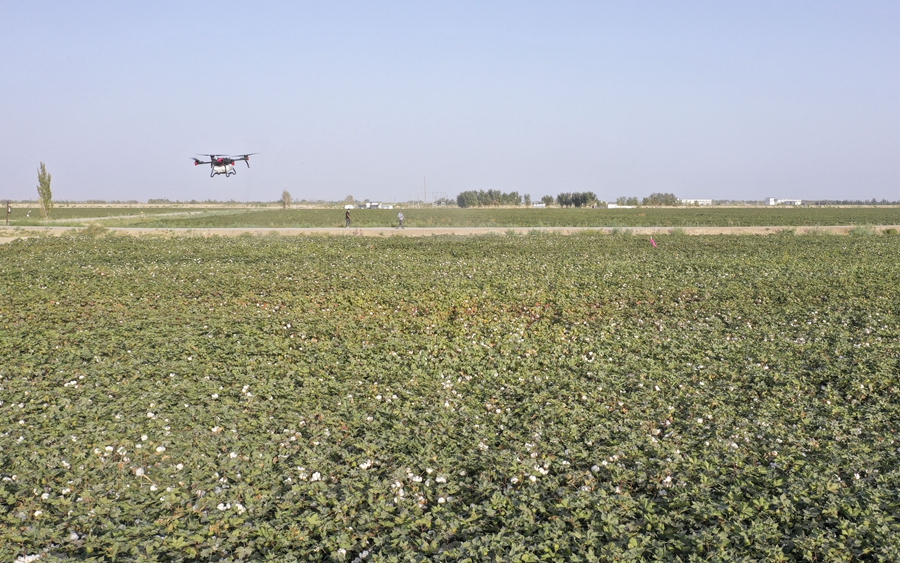 在新疆尉犁縣興平鎮(zhèn)達(dá)西村一處高標(biāo)準(zhǔn)農(nóng)田,種植戶用無(wú)人機(jī)噴灑脫葉劑(2022年9月20日攝,無(wú)人機(jī)照片)。新華社發(fā)(汪志鵬 攝)