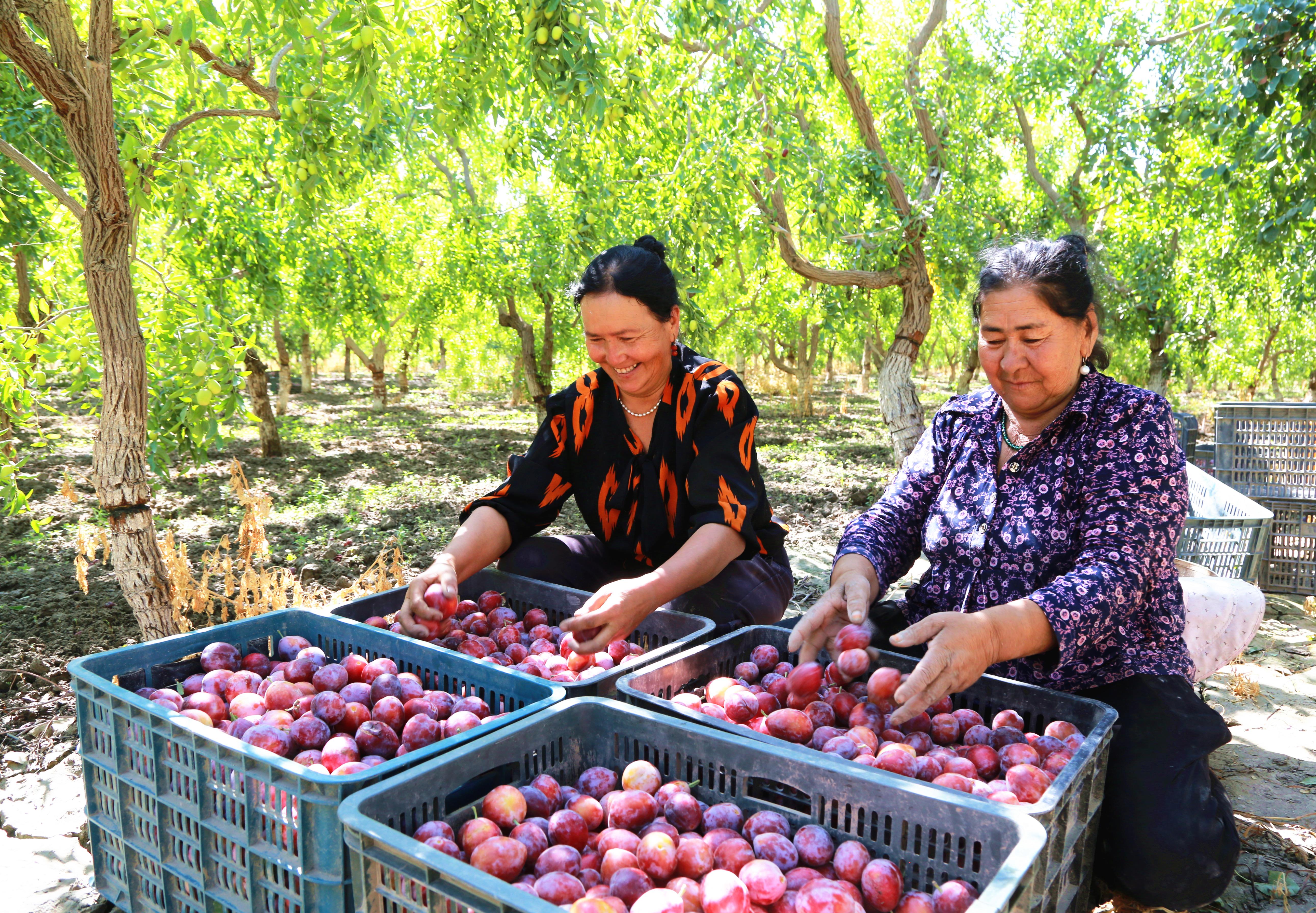 2025年8月19日,新疆阿克蘇地區(qū)阿瓦提縣塔木托格拉克鎮(zhèn)阿克亞村,果農(nóng)分揀西梅。