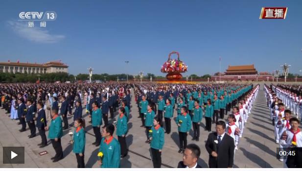 向人民英雄敬獻花籃儀式正式開始,全場高唱國歌。