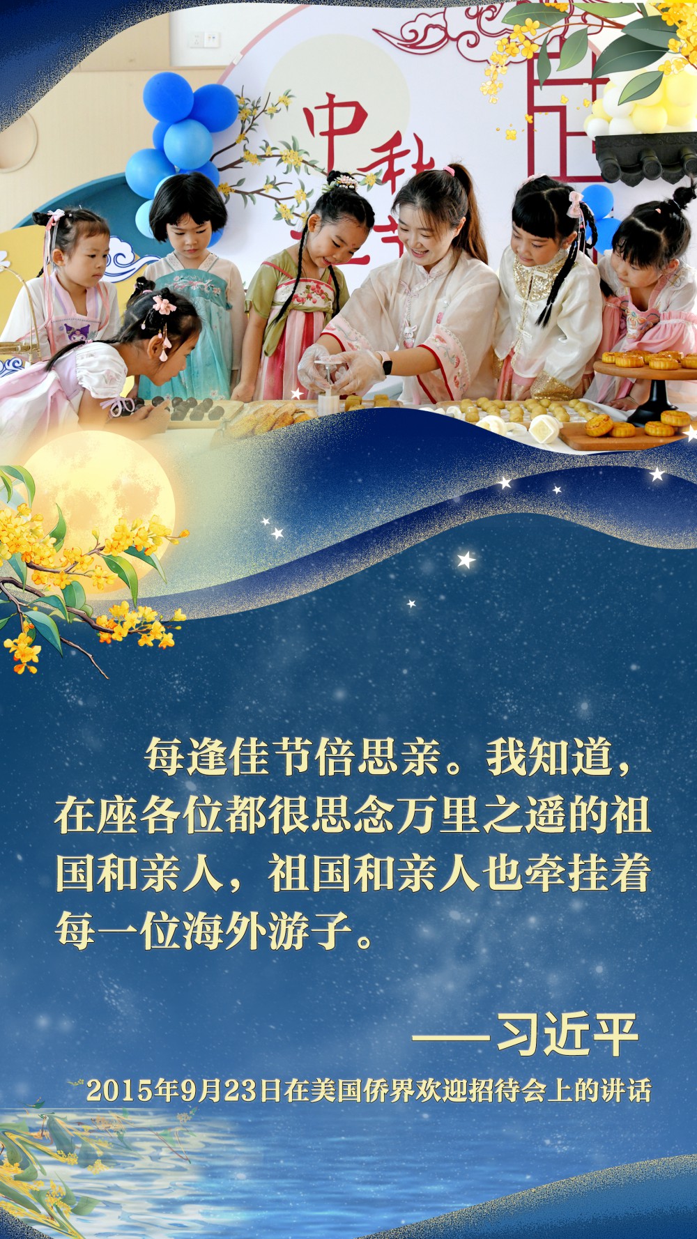 2015年9月23日,中秋佳節(jié)前夕,習(xí)近平總書記在西雅圖出席美國僑界歡迎招待會。他為參加招待會的同胞們帶去了來自家鄉(xiāng)的月餅,并熱情地“歡迎大家?;丶铱纯础?。