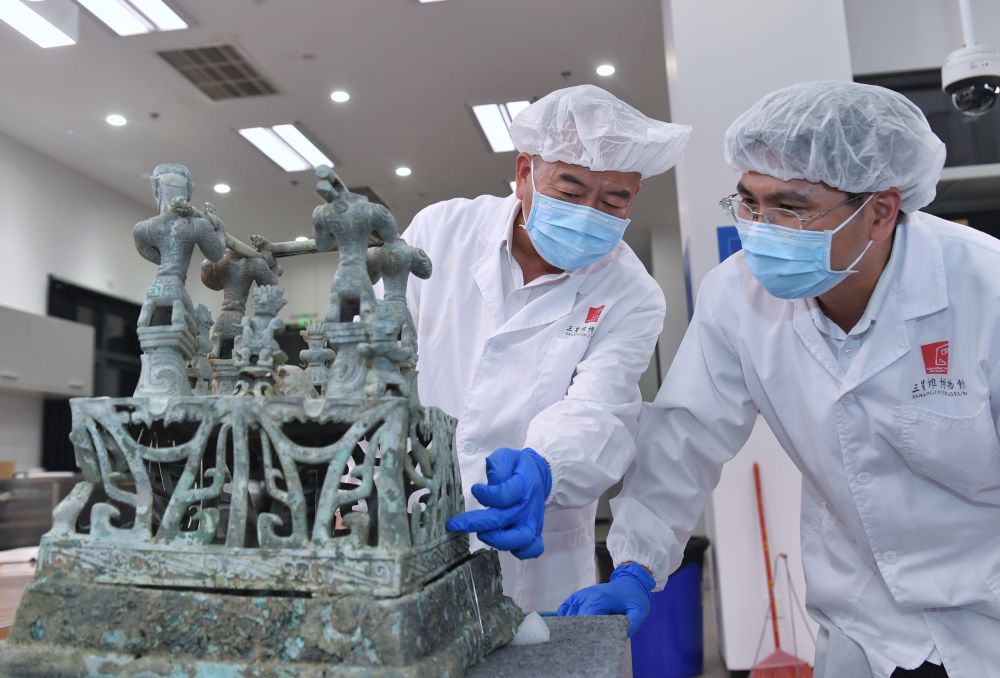 2023年5月30日,在四川三星堆博物館文物保護(hù)和修復(fù)中心,文物修復(fù)師郭漢中(左)與同事討論神壇底座修復(fù)方案。郭漢中從事文物修復(fù)工作已40余年,深度參與了三星堆祭祀坑的發(fā)掘工作,累計修復(fù)文物6000余件。“大概還有上萬件文物等著修復(fù),需要一代接著一代往下干?!惫鶟h中說,他要把平生所學(xué)傳承下去,培養(yǎng)更多人才。