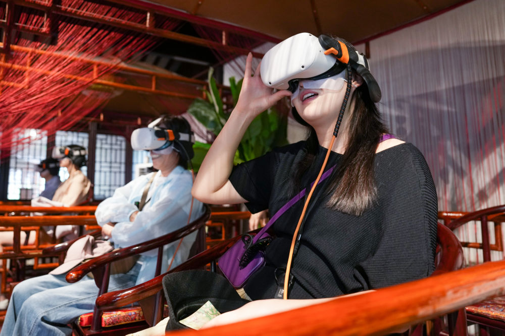 2025年5月18日,游客在江蘇蘇州拙政園體驗VR漫游。近年來,蘇州不斷推進(jìn)“數(shù)字園林”建設(shè),在園林整體數(shù)字建模、園林要素數(shù)據(jù)庫建設(shè)等方面開展探索,利用數(shù)字技術(shù)創(chuàng)造“數(shù)字云游”VR場景,打造“云游拙政園”“獅林園宇宙”“留園虛擬元宇宙”等項目,營造真實可感的虛擬空間,讓觀眾沉浸式感受蘇州園林的獨(dú)特魅力。