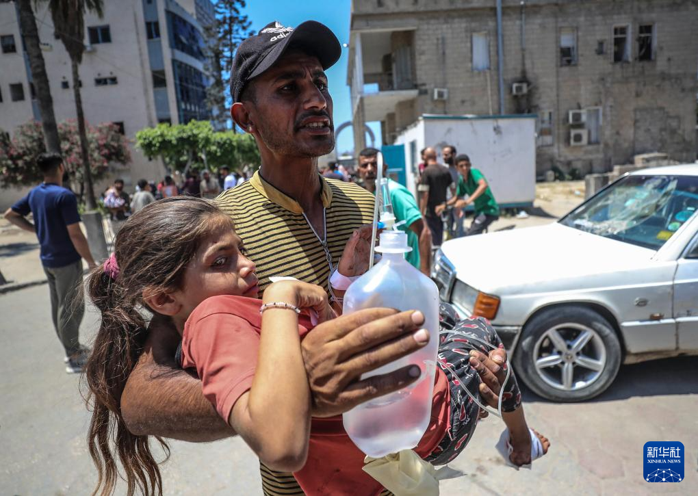 2025年7月13日,在加沙城一所醫(yī)院,一名男子懷抱在以軍空襲中受傷的女孩。新華社發(fā)(馬哈茂德·扎基攝)